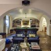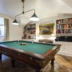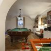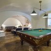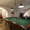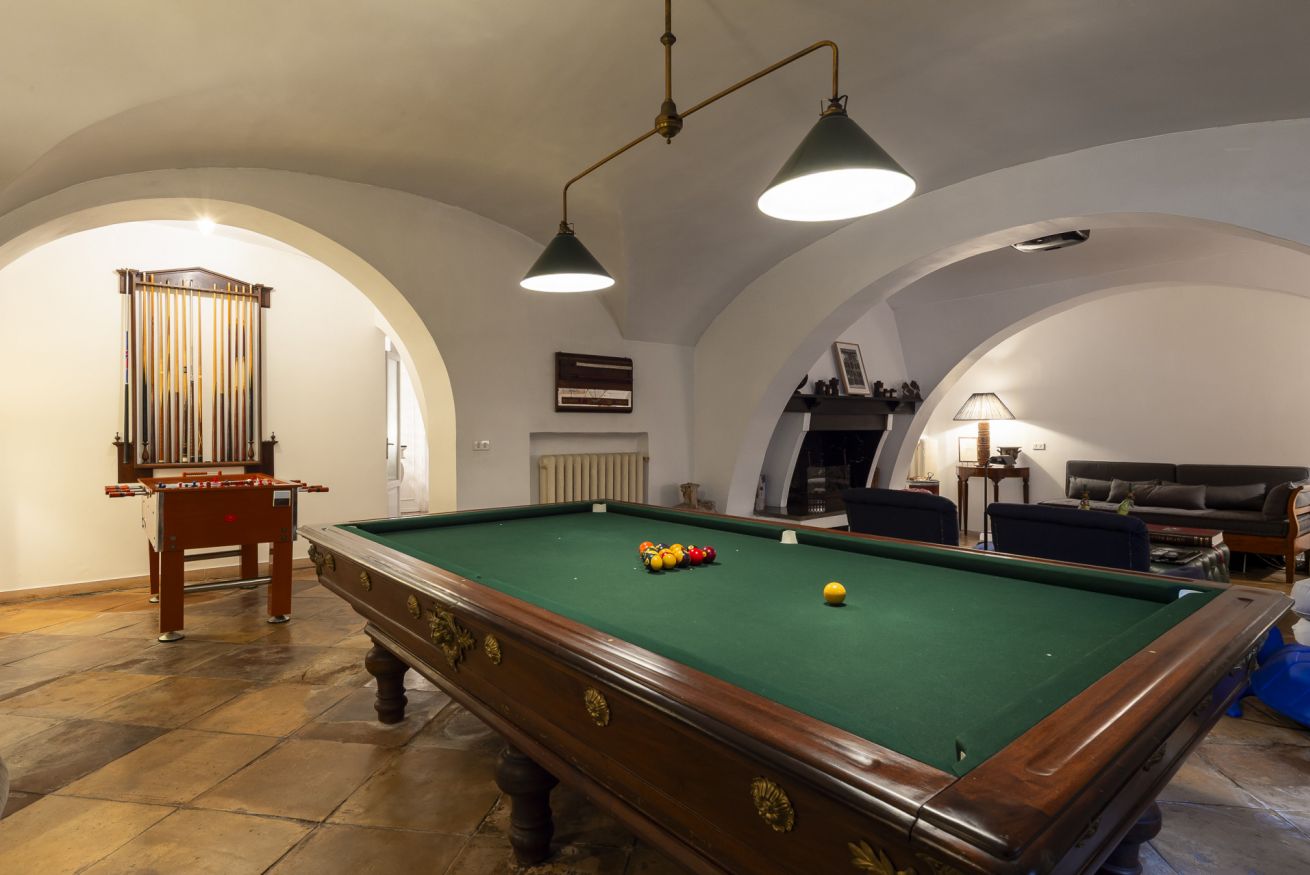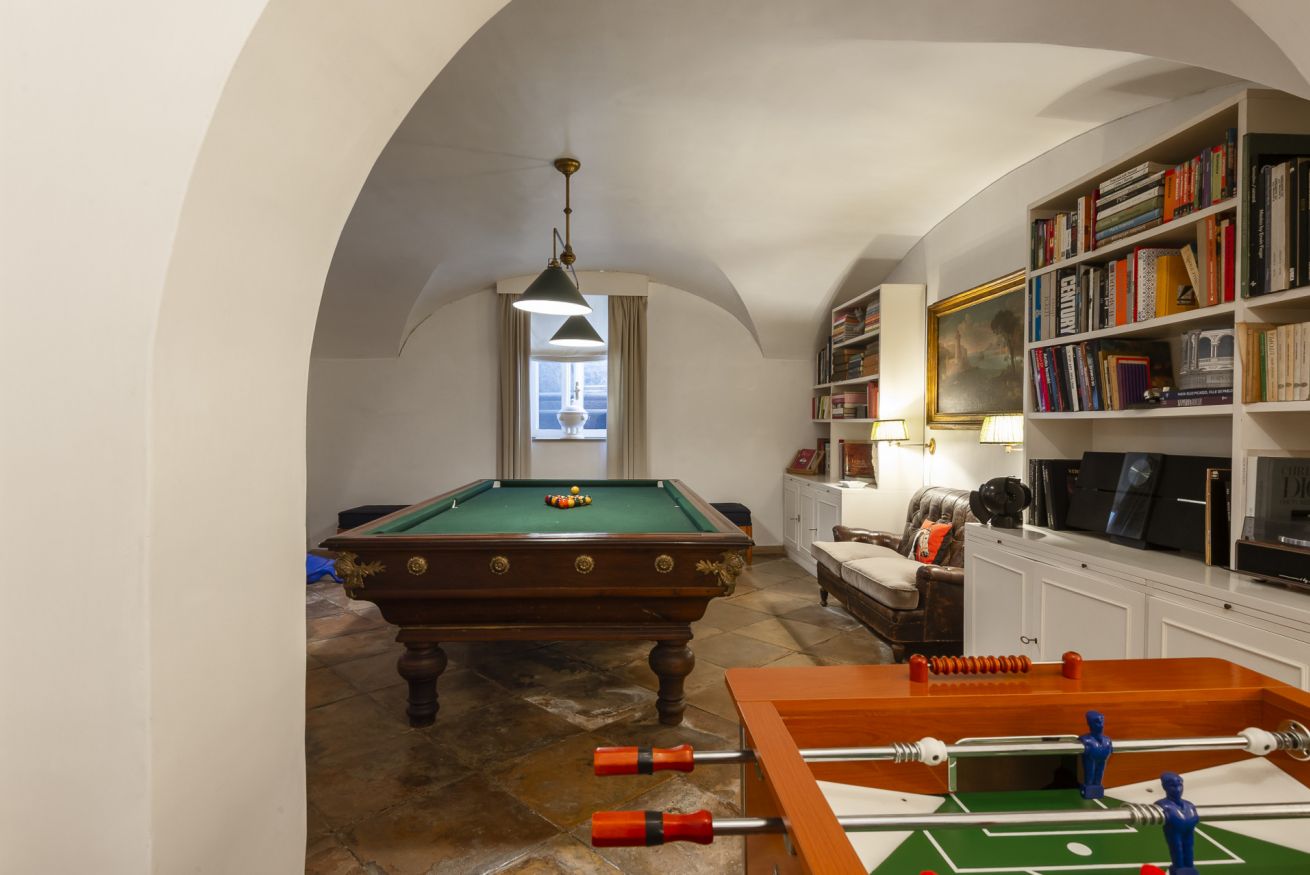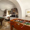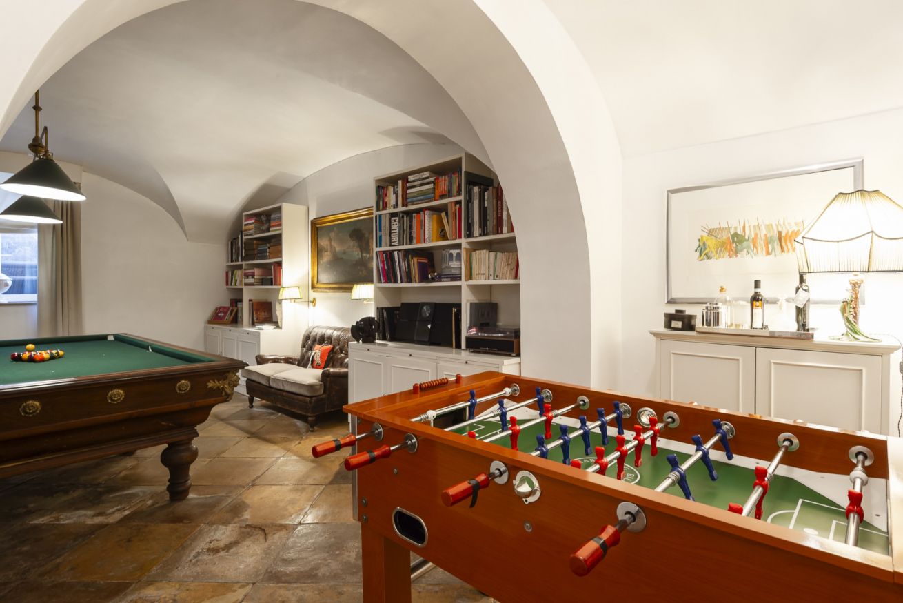 Un'ampia sala hobby con tavolo da calcio balilla e zona cinema con divani e schermo cinematografico, ideale per trascorrere le giornate invernali con amici o familiari.
