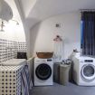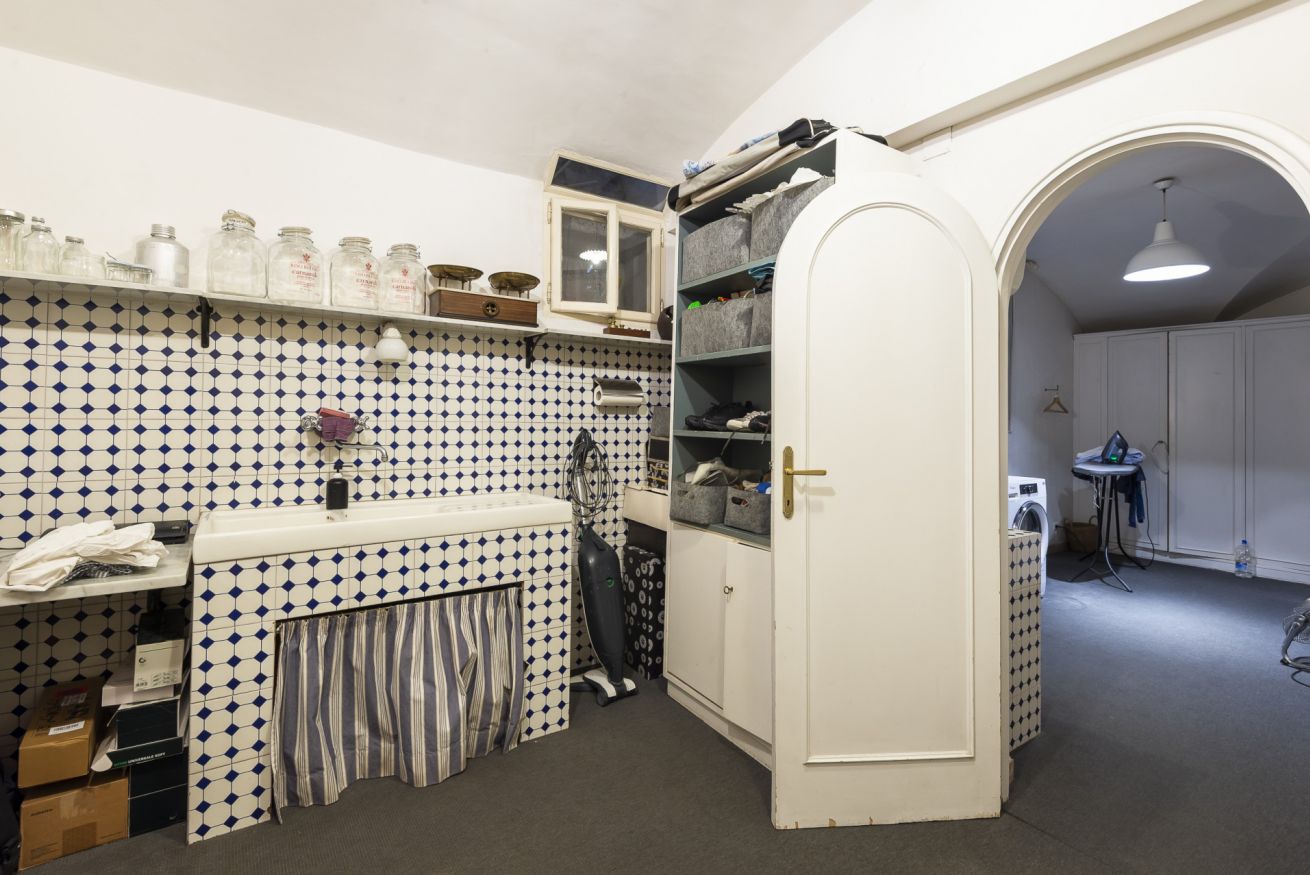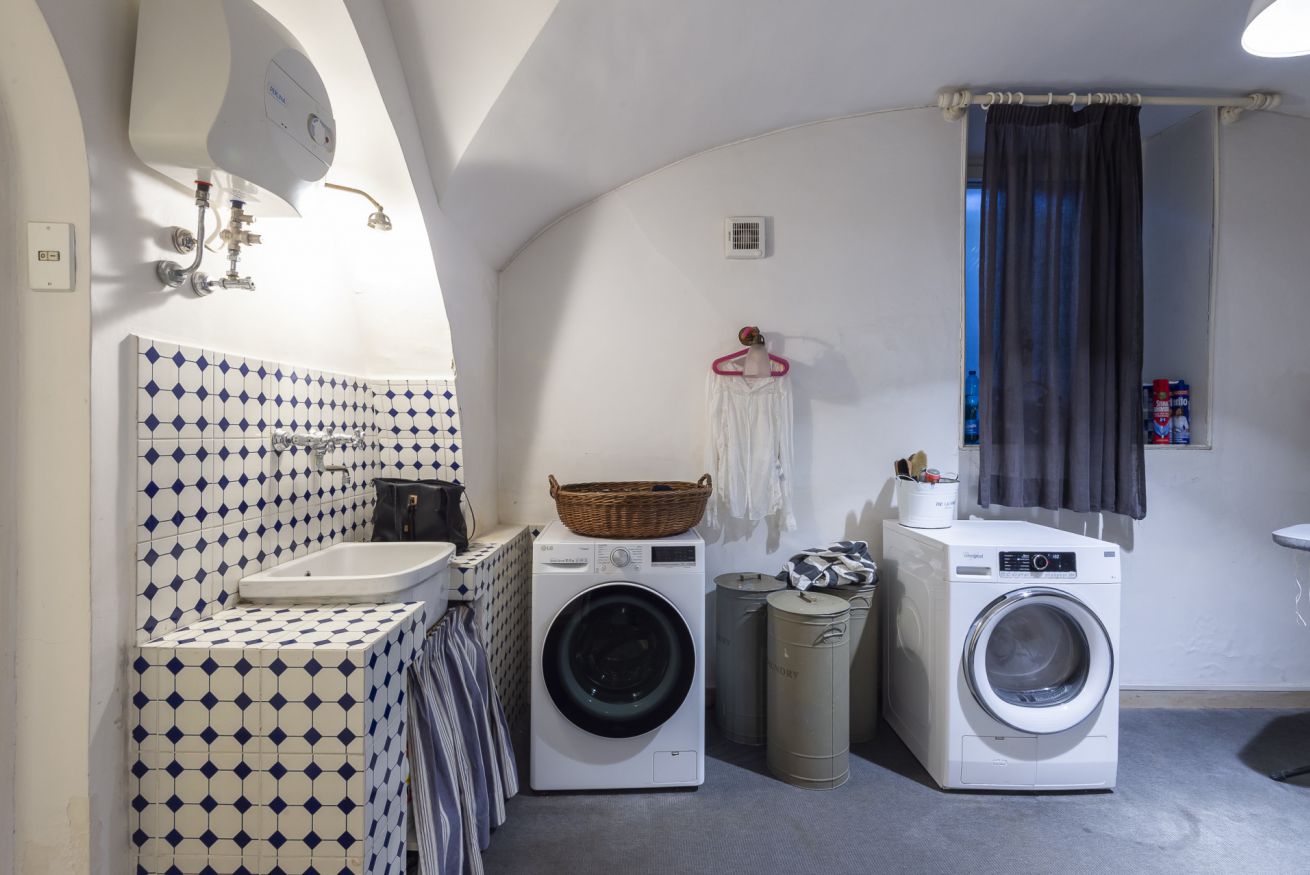 Ampia lavanderia con lavatrice e asciugatrice, spogliatoio e un appartamento di servizio con camera da letto e bagno, che offre spazio per il personale residente o per ospiti aggiuntivi.